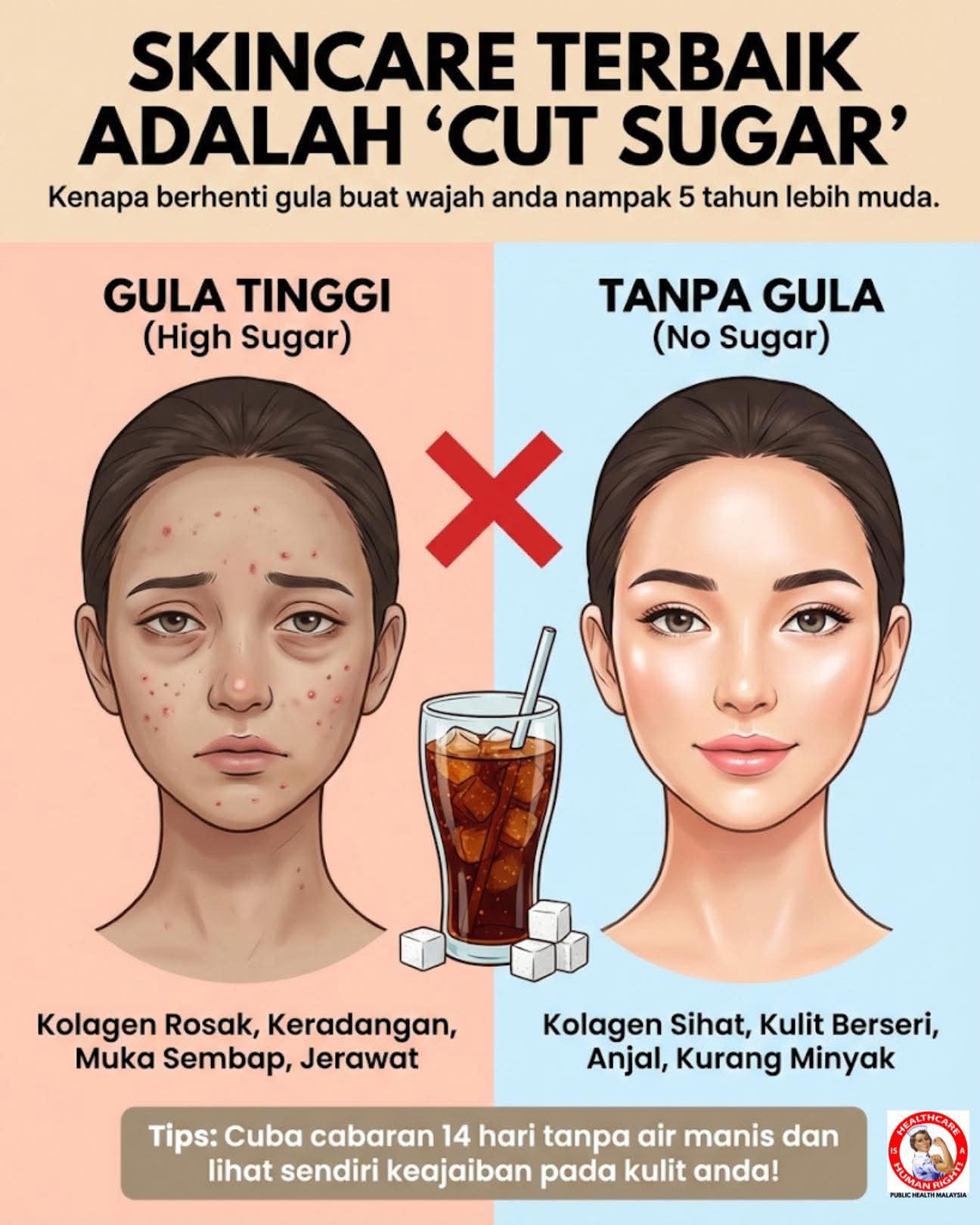 Skincare yang mahal sekalipun takkan mampu lawan kesan “karat” gula dari dalam badan. Nak kulit cantik bukan sekadar apa yang korang tepek kat muka, tapi apa yang korang suap dalam mulut.