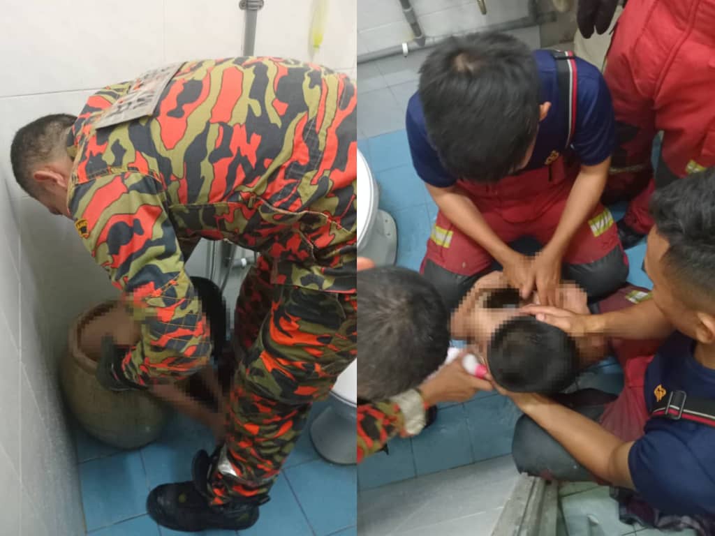 KLANG: Seorang kanak-kanak lelaki berusia lapan tahun berdepan detik cemas tersangkut lebih 15 minit dalam tempayan di bilik air rumahnya di Pangsapuri Saujana Damai di sini malam ini.