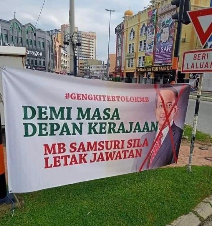Di kain rentang itu, terpampang wajah Ahmad Samsuri yang dipangkah dan tulisan berbunyi: “Demi masa depan kerajaan, MB Samsuri sila letak jawatan. #gengkitertolokMB”.