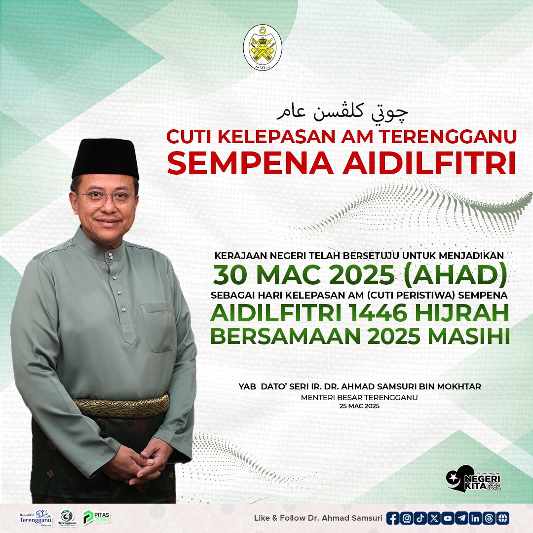 “Kerajaan Negeri telah bersetuju untuk menjadikan hari Ahad, 30 Mac 2025 sebagai Hari Kelepasan Am (cuti peristiwa) sempena Aidilfitri 1446 Hijrah bersamaan 2025 Masihi.