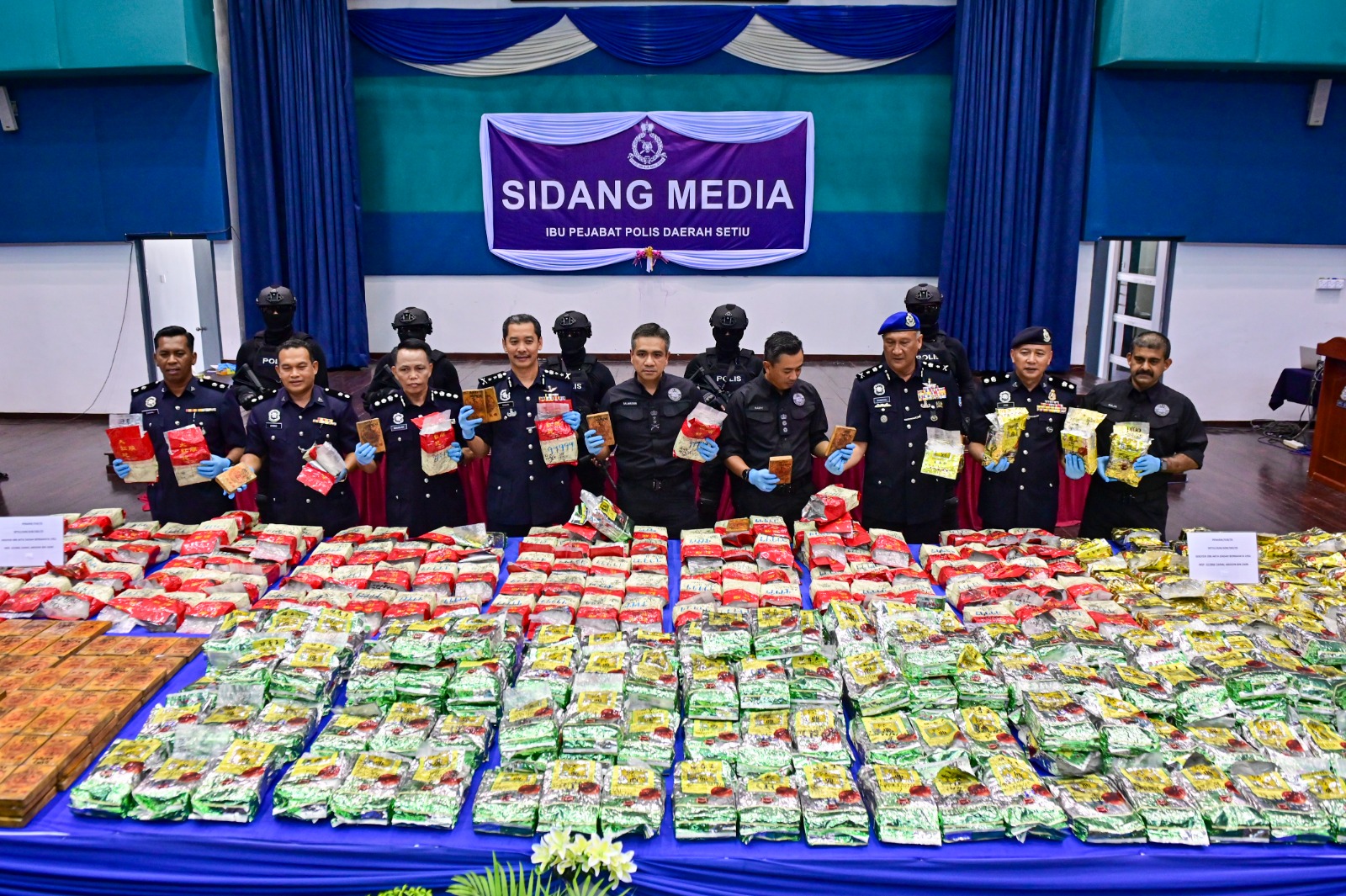 SETIU: Polis menumpaskan sindiket pengedaran dadah antarabangsa terbesar apabila merampas dadah seberat 590.18 kilogram (kg) bernilai lebih RM25 juta di dua lokasi berasingan di daerah ini, 23 April lalu.