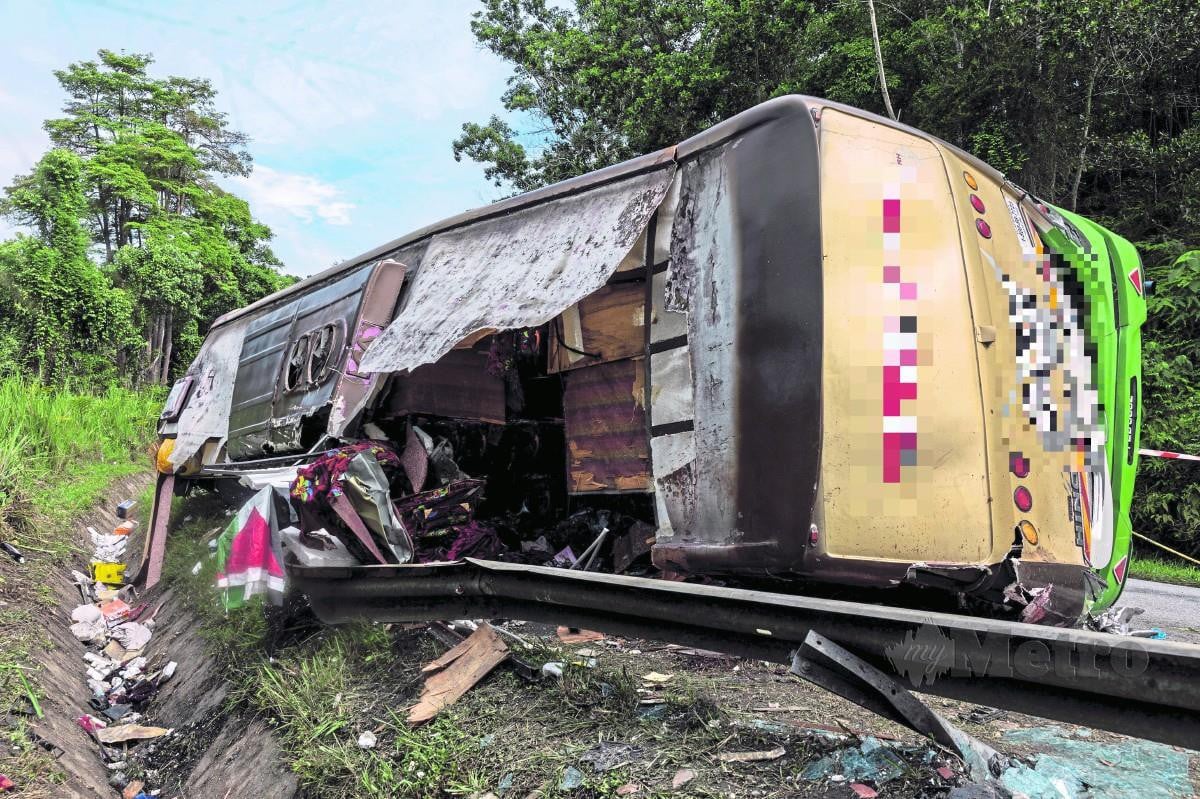 Bas itu dalam perjalanan dari Jerteh, Terengganu dikatakan hilang kawalan sebelum melanggar Perodua Alza dan terbabas. – Harian Metro