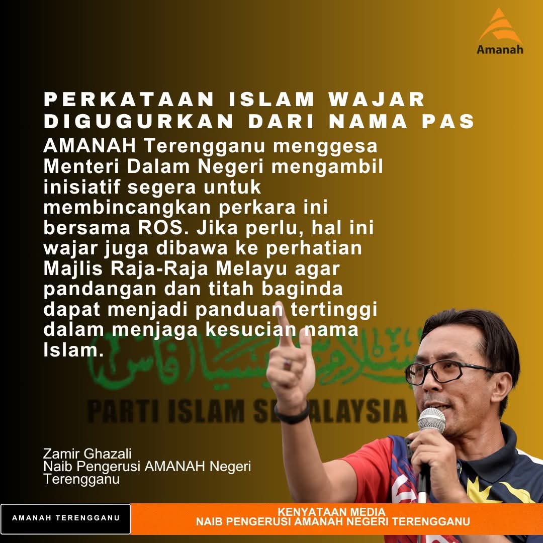 Justeru, beliu berkata, Amanah Terengganu berpandangan sudah tiba masanya Kementerian Dalam Negeri (KDN) bersama Jabatan Pendaftaran Pertubuhan Malaysia (ROS) meneliti secara serius soal penggunaan perkataan Islam dalam nama pertubuhan, khususnya parti politik.