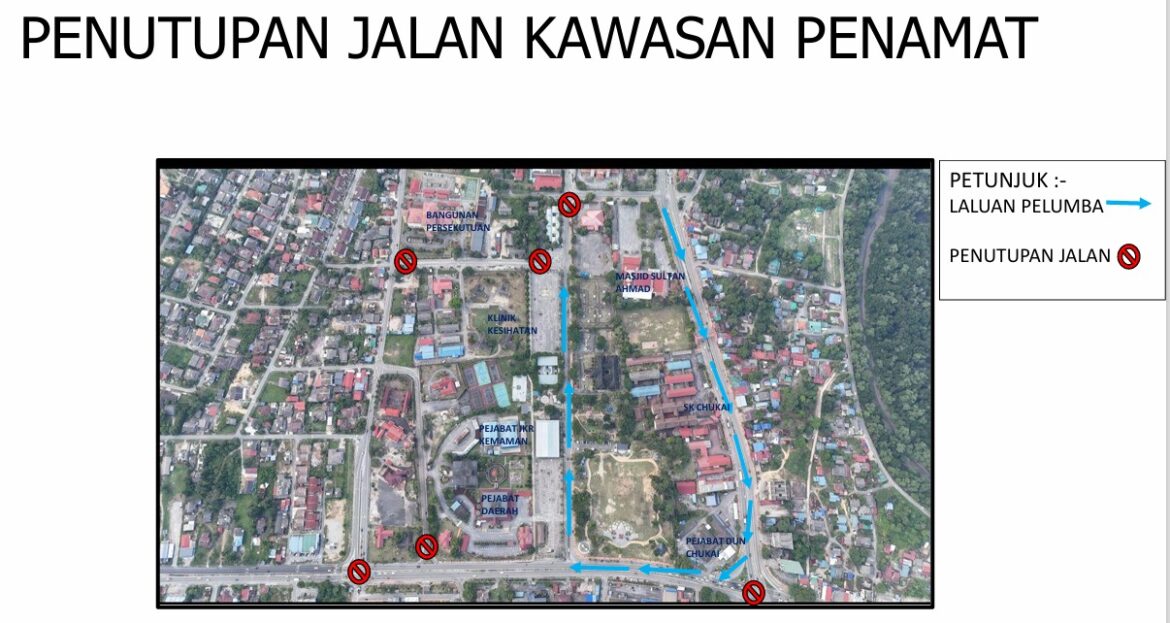 Menurut Mohd Razi, penutupan secara kekal bagi Jalan Padang dan Jalan Padang bermula pukul 8 pagi hingga 4 petang dan Kilometer 1 Jalan Air Putih serta Kilometer 152 Jalan Kuala Terengganu – Kuantan (hadapan Masjid Sultan Ahmad) ditutup bermula pukul 12 tengah hari hingga 3 petang.