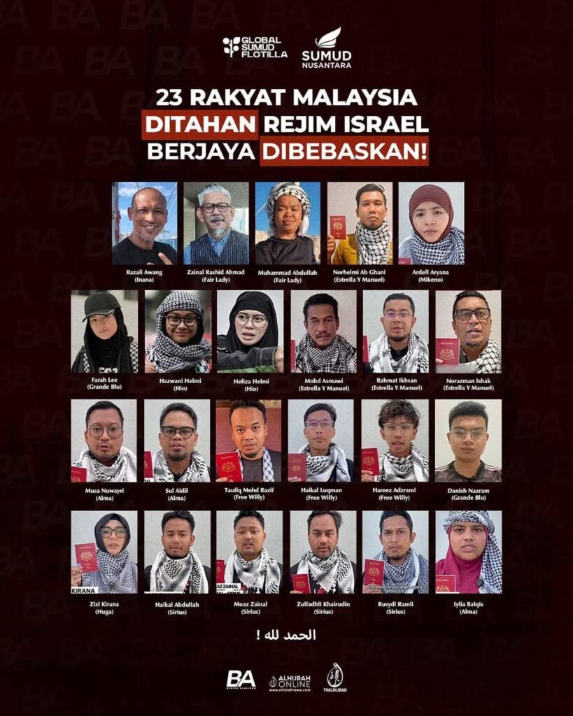 Sebelum ini, Sinar Harian melaporkan, 23 rakyat Malaysia itu dalam perjalanan ke Lapangan Terbang Ramon, Israel menuju ke Istanbul selepas dibebaskan daripada tahanan rejim Zionis.