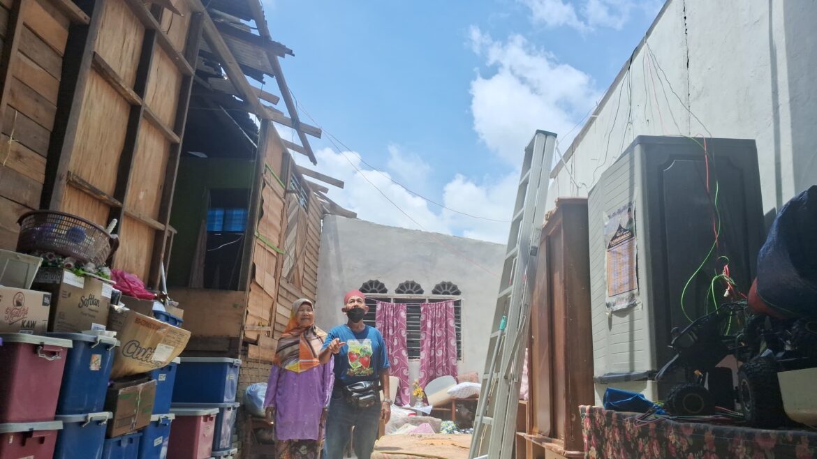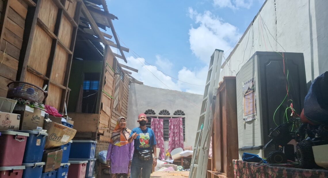 “Bila angin dan hujan dah reda, kami terkejut melihat separuh atap rumah bahagian bilik dan ruang tamu sudah terbang dan hanya berbumbungkan langit,” katanya.