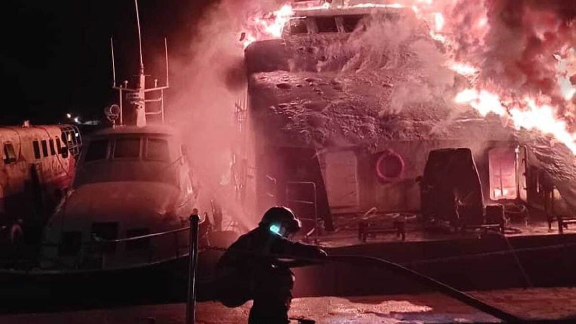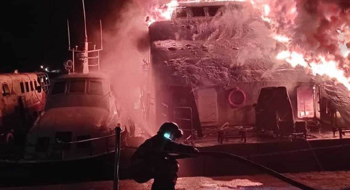 LANGKAWI: Tiga feri sedang diselenggara di limbungan pembaikan kapal di Bukit Malut di sini, musnah dalam kebakaran, 2.15 pagi, semalam.