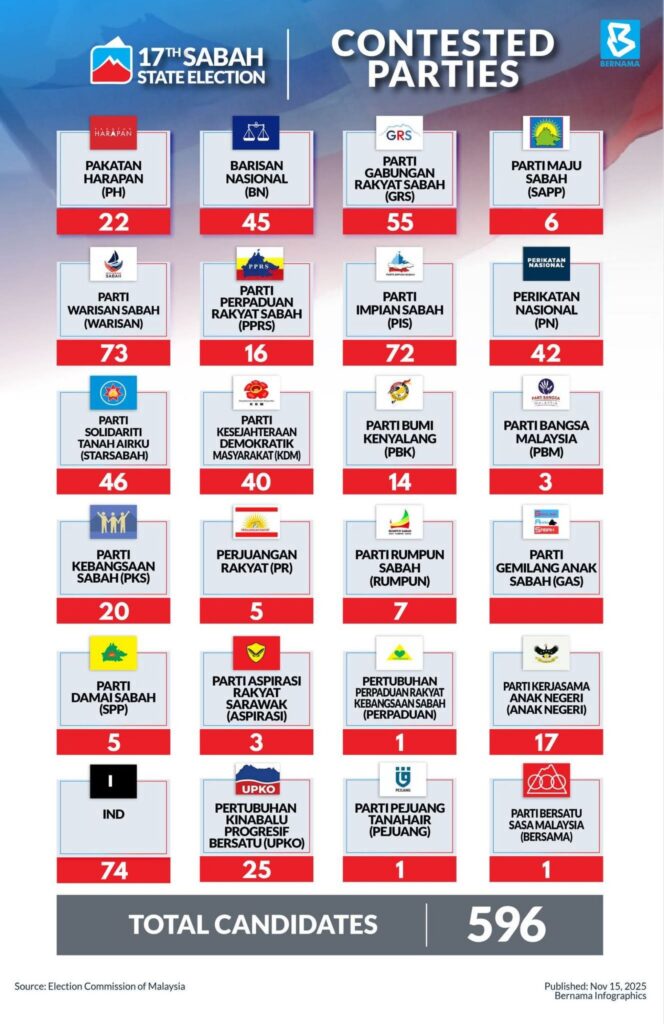 KOTA KINABALU: Seramai 596 calon mewakili individu atau parti disahkan bertanding bagi merebut 73 kerusi Dewan Undangan Negeri (DUN) pada Pilihan Raya Negeri (PRN) Sabah ke-17, selepas proses penamaan calon ditutup jam 10 pagi tadi.