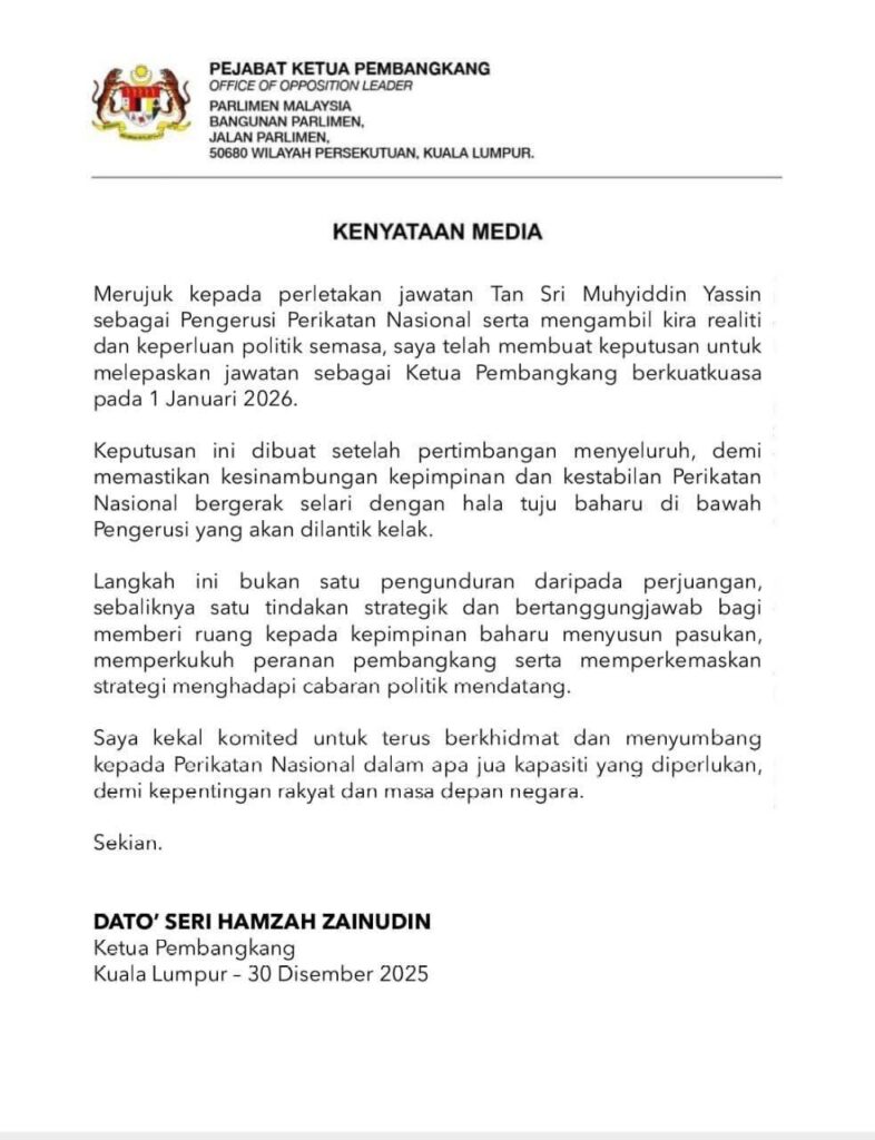 KUALA LUMPUR: Datuk Seri Hamzah Zainudin mengumumkan peletakan jawatan sebagai Ketua Pembangkang berkuat kuasa 1 Januari 2026, menyusuli tindakan yang diambil pimpinan tertinggi Perikatan Nasional (PN).